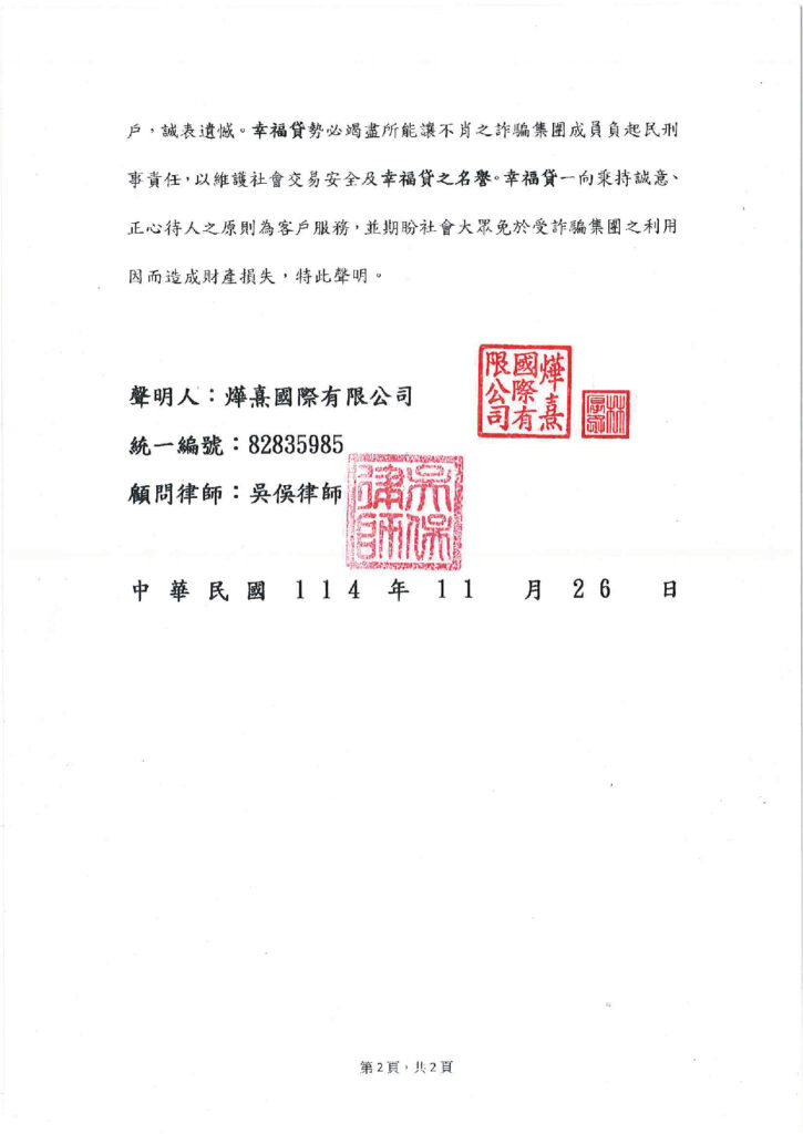 幸福貸款已默默耕耘近二十年,對客戶一直秉持著誠心且正心待人的理念,深受客戶信任。但近日有仿冒者想利用我們累積至今的信任,賺取非法的錢財,為了讓客戶不再受騙,我們特此發此聲明,並公布這位仿冒者的資訊,請大家切勿受騙上當。